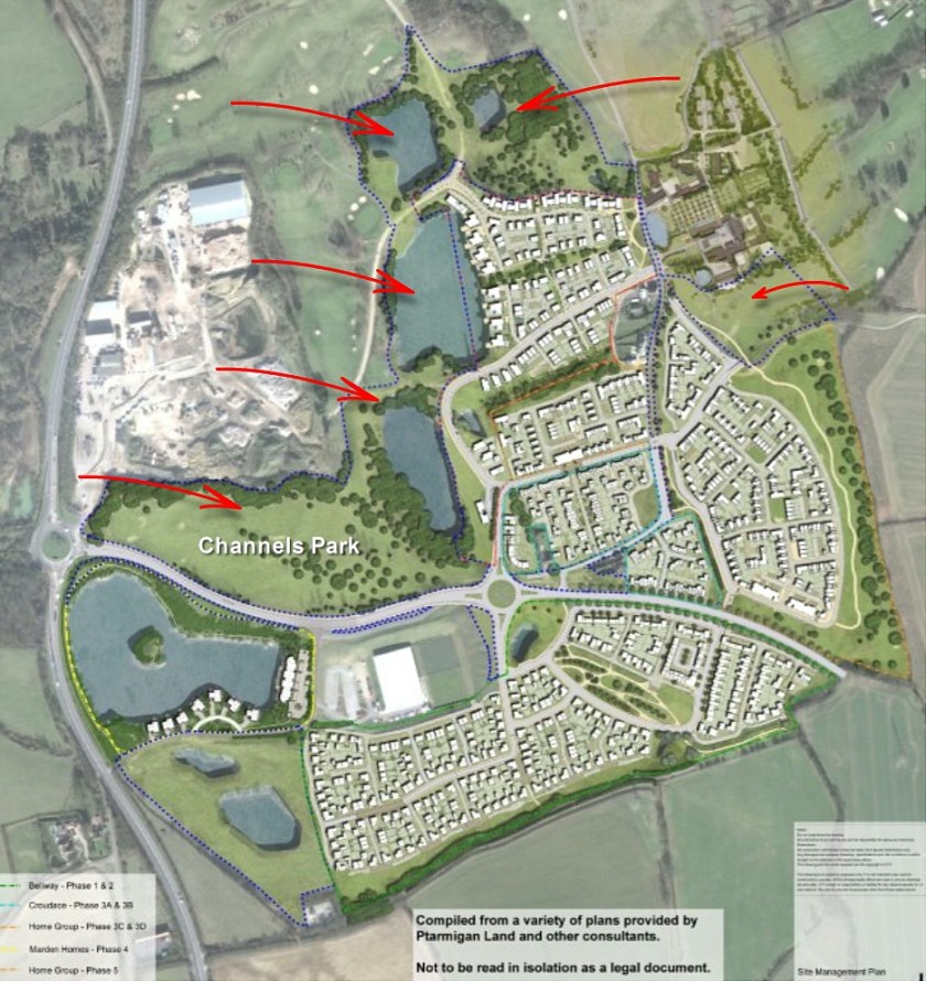 The diagram below shows three key land areas. The area within the red boundary represents the current Channels development and includes all phases of building that were originally planned. The darker blue boundary represents land that was identified as part of the original master plan and is where the 18 hole golf course was to be re-provided. The lighter blue areas belong to the landowner and part of this land (Little Channels) is where new golfing & leisure facilities are proposed to be situated.