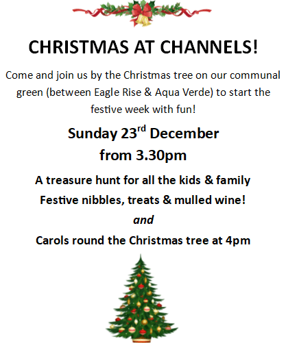 With the support of those working across the development, and at the Channels Estate, we will see the installation of a lit Christmas tree on the communal green area between Eagle Rise & Aqua Verde. All being well, we will also have a marquee erected (purchased with our grant) so that if the weather is as unkind as it was in 2018, the fun can continue!